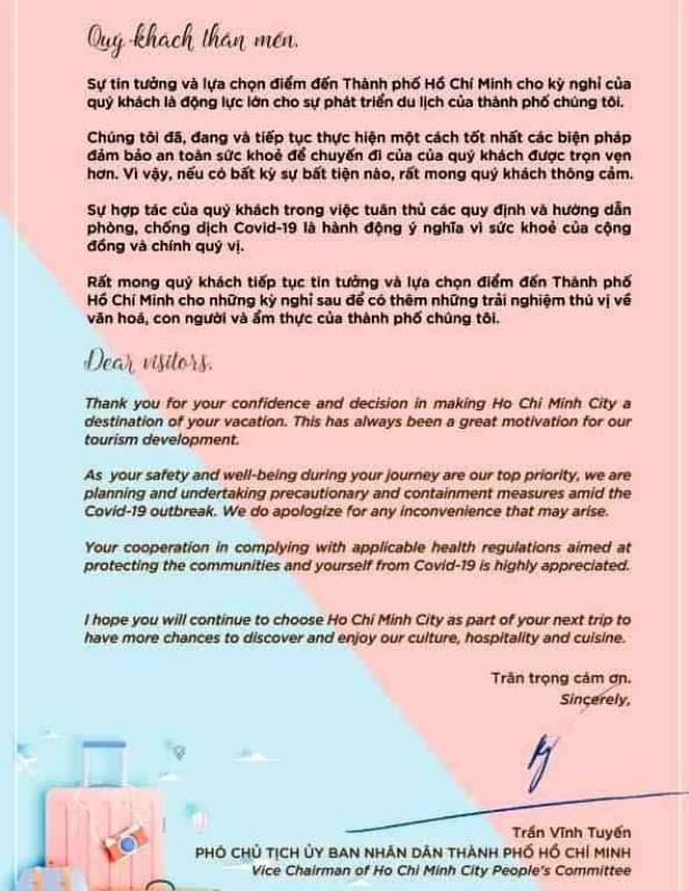Ngày 17-3, để khẳng định quyết tâm phòng, chống dịch bệnh COVID-19, Phó Chủ tịch UBND TP.HCM Trần Vĩnh Tuyến vừa ký thư kêu gọi khách du lịch đến TP chung tay hợp tác trong công tác phòng, chống dịch bệnh, góp phần xây dựng hình ảnh điểm đến "Hấp dẫn - Thân thiện - An toàn".