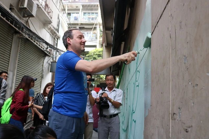 Ông Steph Lysaght đã hào hứng bắt tay cùng sơn lại bức tường. ẢNH: THANH TUYỀN