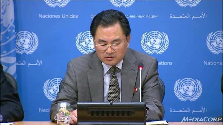 Phó Đại sứ Bình Nhưỡng An Myong Hun phát biểu tại Liên Hợp Quốc (Ảnh: Channel News Asia)