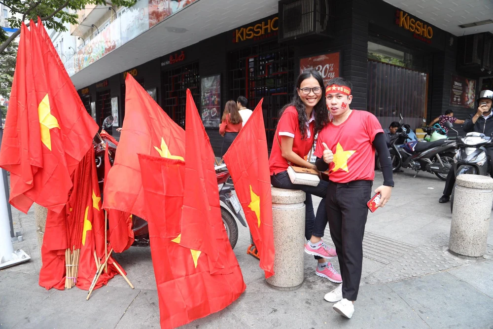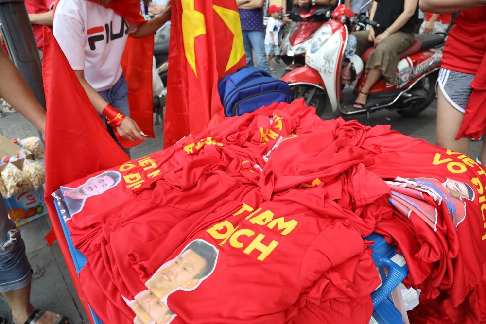 Áo thun, cờ và băng rôn được bày bán khắp các ngả đường TP.HCM.