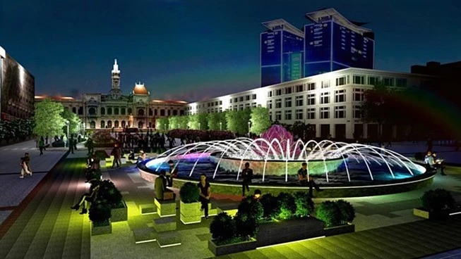 Phối cảnh đài phun nước nghệ thuật tại giao lộ Nguyễn Huệ - Lê Lợi về đêm. Ảnh: Sở Quy hoạch - Kiến trúc TP.HCM.