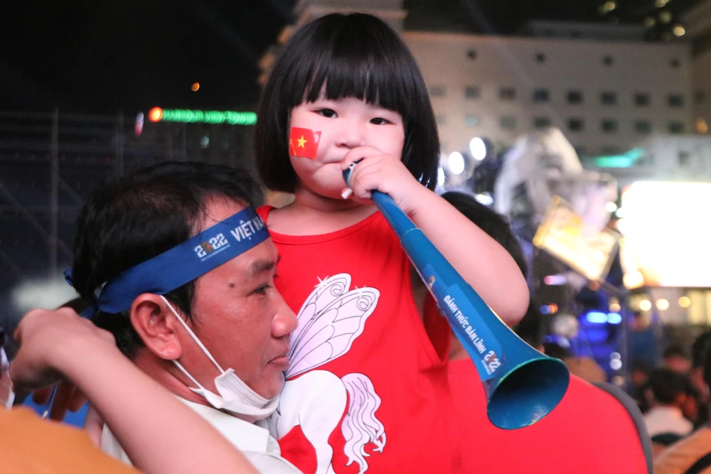 Các cổ động viên nhí cũng theo ba đi cổ vũ cho đội Việt Nam. Ảnh: TÂM THƠ |
