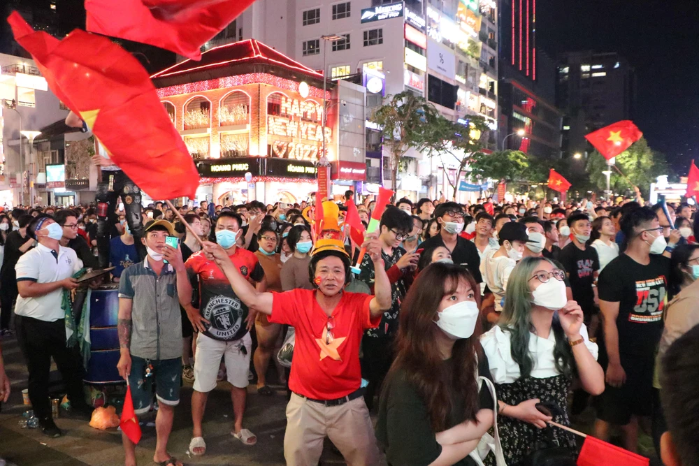 (PLO)- Bàn thắng duy nhất của Tiến Linh ở hiệp phụ thứ hai đã khiến cổ động viên vỡ òa, phố đi bộ Nguyễn Huệ nóng hừng hực sắc màu cờ đỏ Việt Nam.