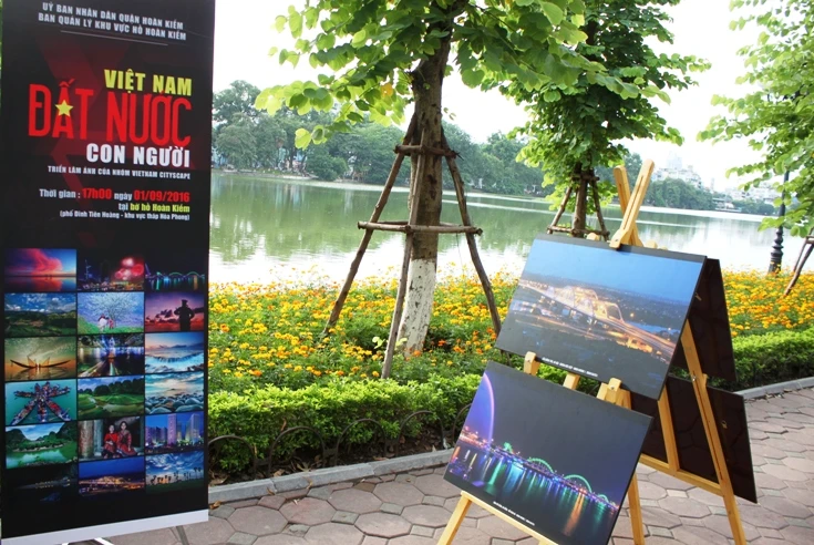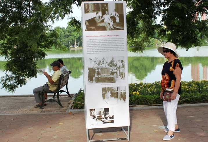 Quanh Hồ Gươm, không gian lịch sử nói về Cách Mạng Tháng Tám đã được dựng lên. Những hình ảnh về hoạt động của Hồ Chủ tịch và Chính phủ lâm thời Việt Nam Dân chủ Cộng hòa được chú thích rõ ràng, ngắn gọn.