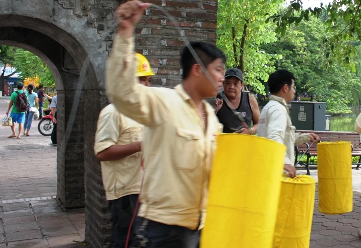 Ông Đặng Ngọc Tiến, Phó ban Quản lý phố cổ quận Hoàn Kiếm, cho biết việc treo đèn lồng mới được quyết định vào đêm hôm qua, 31-8. Chính vì vậy, công việc chuẩn bị khá tất bật vì phải đảm bảo an toàn cho du khách khi đi bộ xung quanh Hồ Gươm.