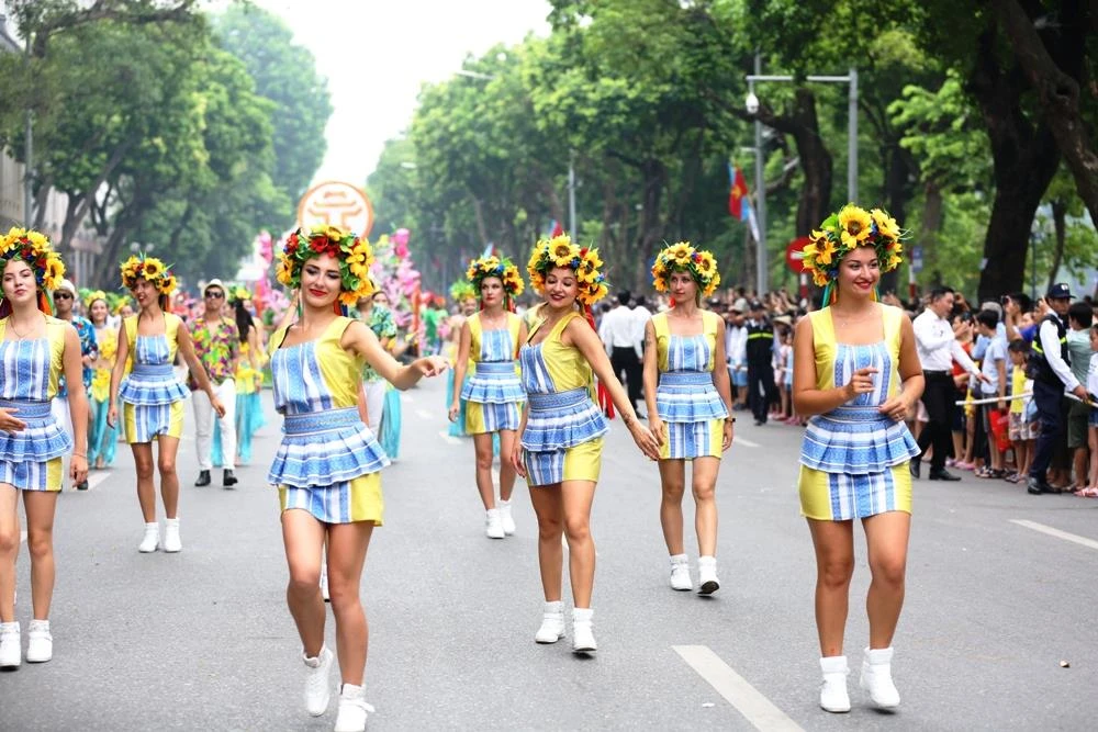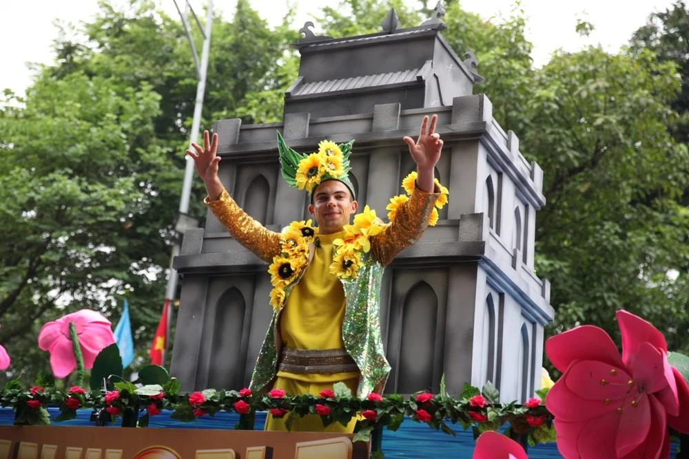 Diễn ra trong khung giờ từ 9 giờ đến 11 giờ sáng ngày 14-7, Carnival đường phố với sự xuất hiện của xe hoa và gần 100 nghệ sĩ chuyên nghiệp trong nước và quốc tế trong trang phục rực rỡ sắc màu đã khuấy động đường phố Hà Nội.