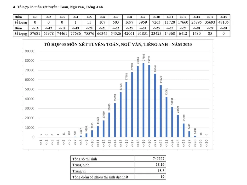 Kết quả phân tích điểm thi theo tổ hợp 3 môn xét tuyển Toán, Ngữ văn, Tiếng Anh cho thấy: Điểm trung bình là 18,19 điểm, điểm trung vị là 18,3 điểm; tổng điểm có nhiều thí sinh đạt nhất là 19 điểm.