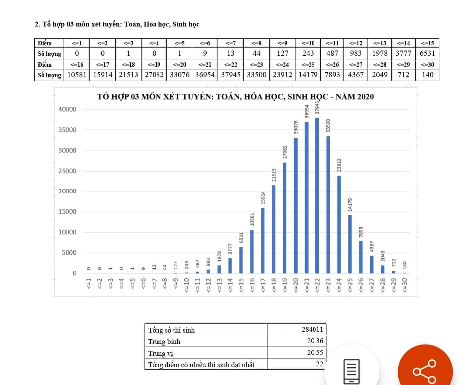 Kết quả phân tích điểm thi theo tổ hợp 3 môn xét tuyển Toán, Hóa học, Sinh học: Điểm trung bình là 20,36 điểm, điểm trung vị là 20,55 điểm; tổng điểm có nhiều thí sinh đạt nhất là 22 điểm.