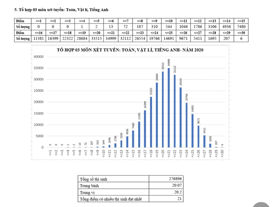 Kết quả phân tích điểm thi theo tổ hợp 3 môn xét tuyển Toán, Vật lí, Tiếng Anh: Điểm trung bình là 20,07 điểm, điểm trung vị là 20,2 điểm; tổng điểm có nhiều thí sinh đạt nhất là 21 điểm.