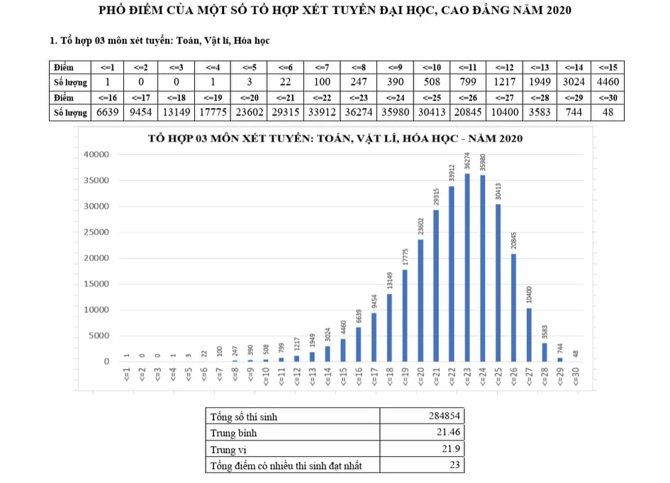 Kết quả phân tích điểm thi theo tổ hợp 3 môn xét tuyển Toán, Vật lí, Hóa học: Điểm trung bình là 21,46 điểm, điểm trung vị là 21,9 điểm; tổng điểm có nhiều thí sinh đạt nhất là 23 điểm.