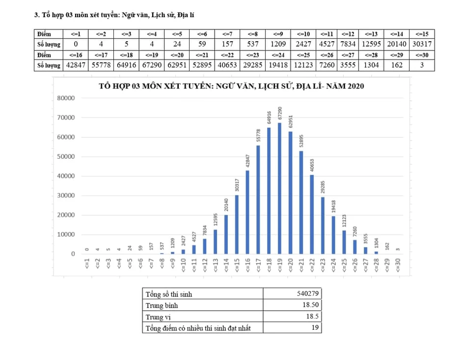 Kết quả phân tích điểm thi theo tổ hợp 3 môn xét tuyển Ngữ văn, Lịch sử, Địa lí: Điểm trung bình là 18,5 điểm, điểm trung vị là 18,5 điểm; tổng điểm có nhiều thí sinh đạt nhất là 19 điểm.