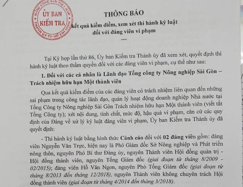 Theo đó, tại kỳ họp lần thứ 86, Ủy ban Kiểm tra Thành ủy đã xem xét, quyết định thi hành kỷ luật các đảng viên vi phạm trong công tác lãnh đạo, quản lý hoạt động tại Tổng Công ty Nông nghiệp Sài Gòn TNHH một thành viên (SAGRI) qua các thời kỳ.