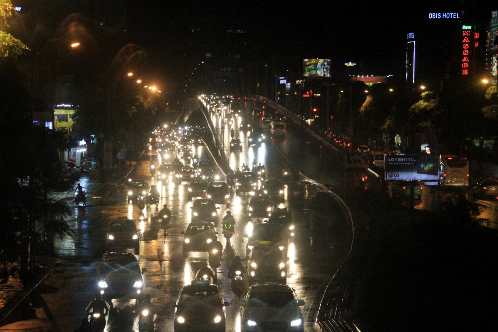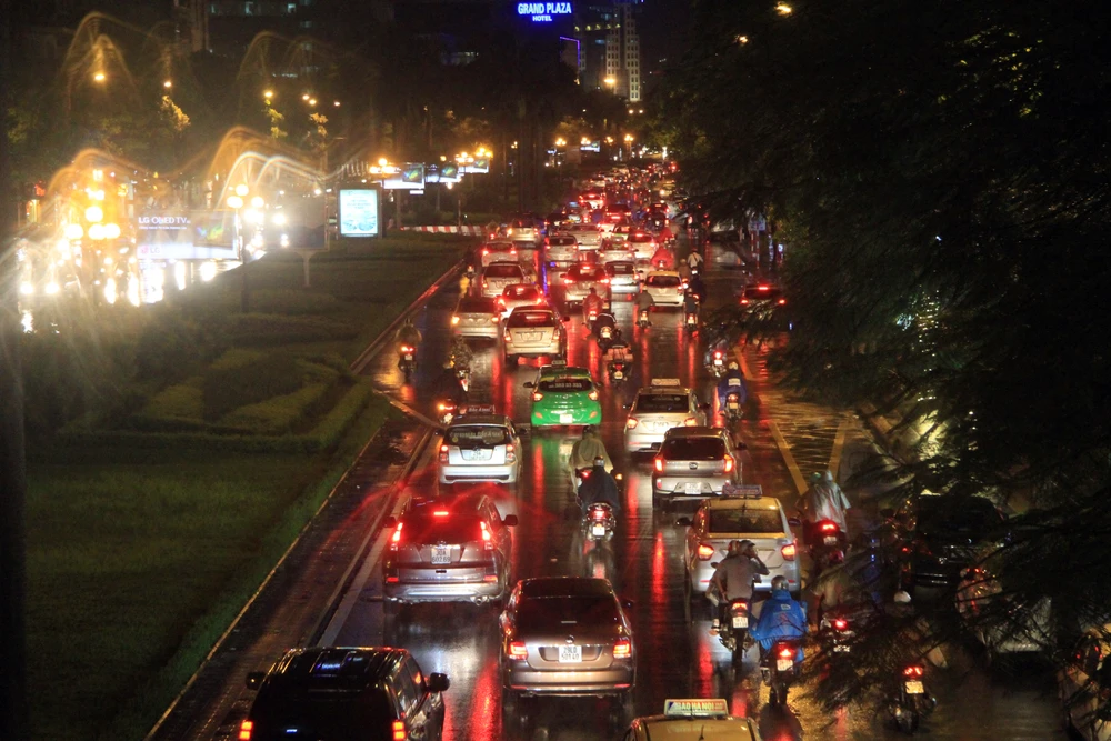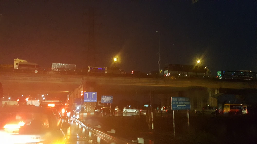 Cơn mưa lớn vào đúng giờ tan tầm gây ùn tắc trên nhiều tuyến đường chính ở Hà Nội, thậm chí lan cả lên tuyến đường vành đai II, trên cao. Trong ảnh, hàng dài ô tô tắc cứng trên đường trên cao, đoạn cắt Tam Trinh lúc 19h. (ảnh: Hoàng Trọng Hiếu)