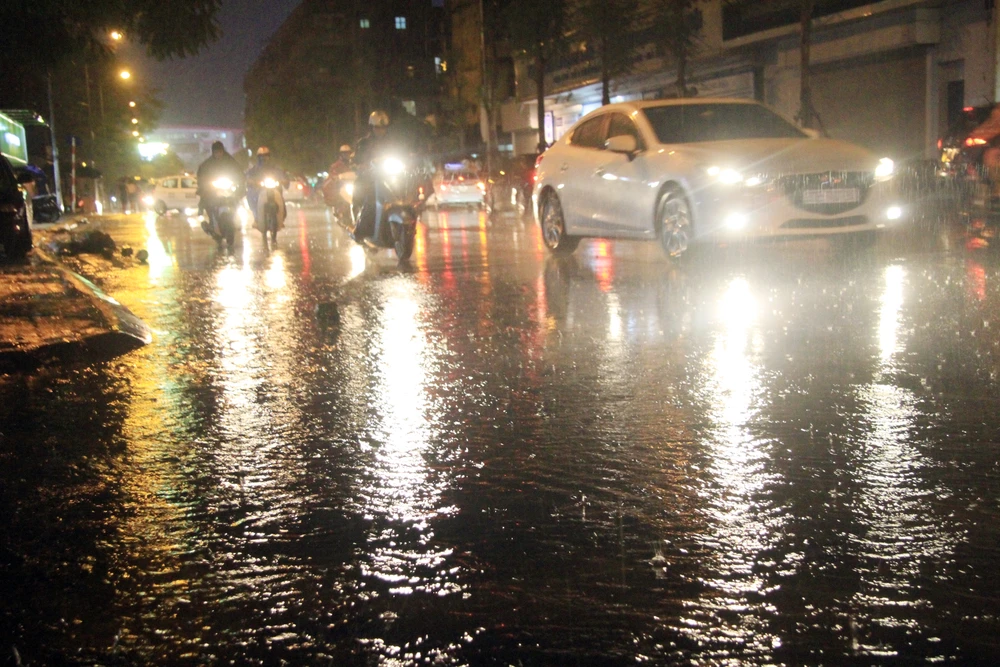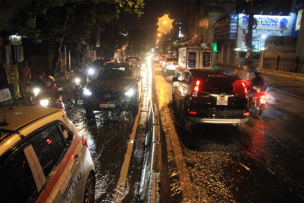 Mặc dù không ngập nước, nhưng đường Trần Duy Hưng các phương tiện cũng di chuyển khó khăn, khi đường trơn.
