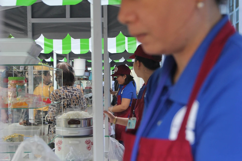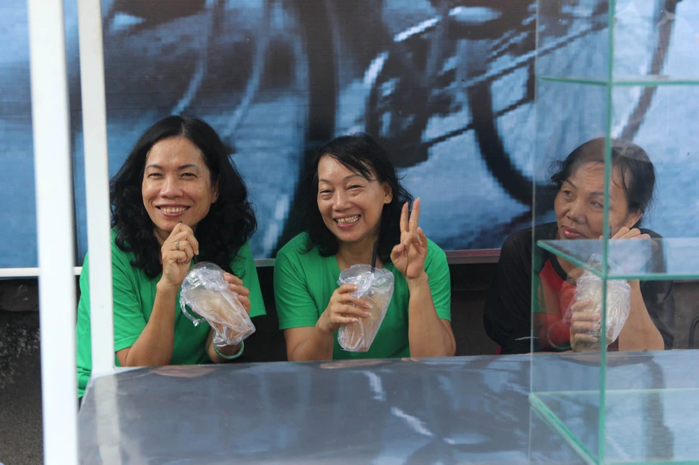 Nhóm của cô Nguyễn Thị Thu Hà (quận 3) cứ mỗi ngày tập thể dục xong đều ghé lại ủng hộ gian hàng của một người bạn.