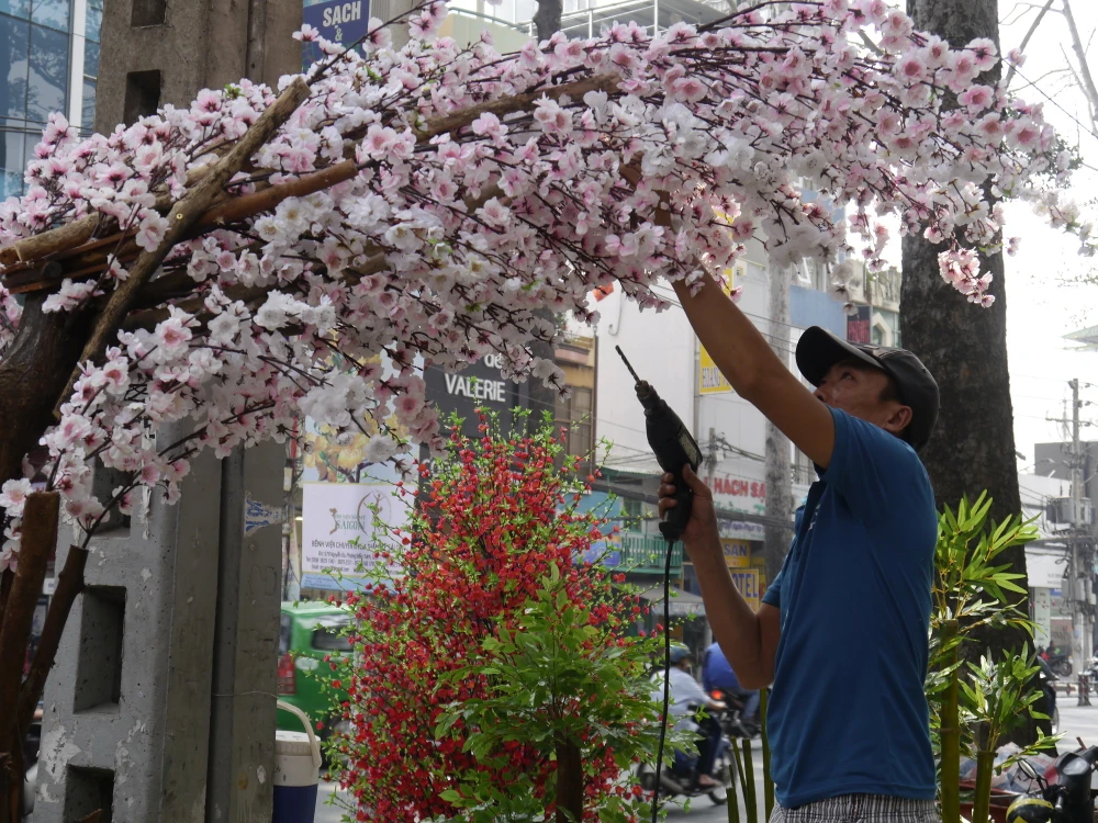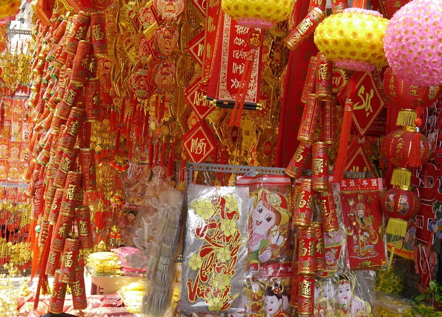Các cửa hàng bán vật phẩm trang trí phục vụ cho Tết Nguyên đán như: bao lì xì, đèn lồng, câu đối đỏ, tranh tết,… trên đường Võ Thị Sáu (Q.1), Hải Thượng Lãn Ông(Q.5). Với màu sắc rực rỡ khiến lòng người qua đây có được sự ấm áp của không khí sum vầy gia đình.
