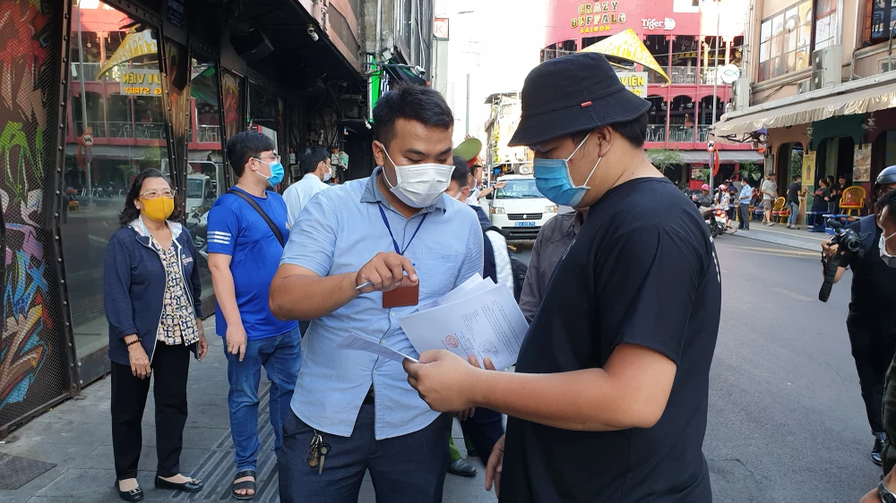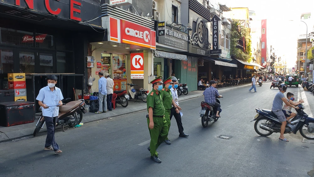 Tổ công tác của UBND phường Phạm Ngũ Lão đến nhiều địa điểm kinh doanh trên đường Bùi Viện, Đỗ Quang Đẩu, Phạm Ngũ Lão để vận động các cơ sở.