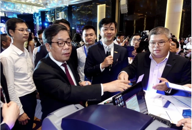 Trải nghiệm thẻ chip tại sự kiện công bố ra mắt sản phẩm thẻ chip nội địa của các ngân hàng ngày 28-5-2019, Hà Nội.