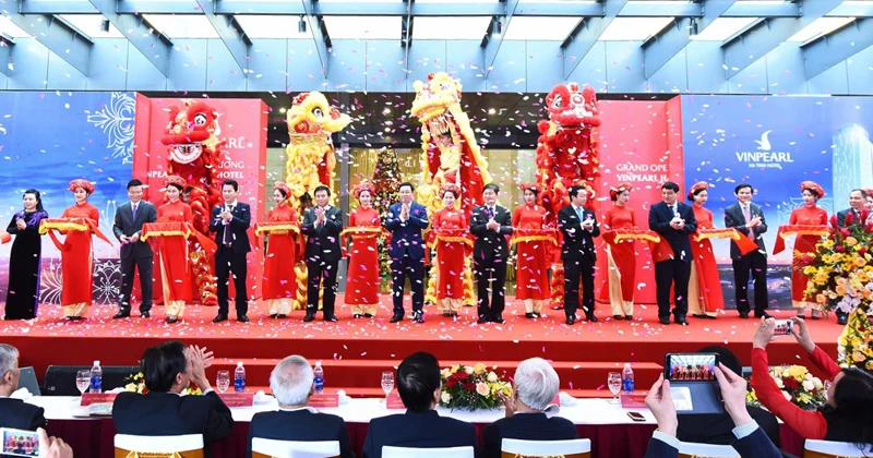Phó Thủ tướng Vương Đình Huệ cùng lãnh đạo bộ, ngành, địa phương và nhà đầu tư cắt băng khai trương Vinpearl Hà Tĩnh Hotel.