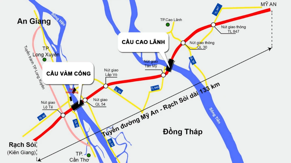 Cầu Cao Lãnh bắc qua sông Tiền có chiều dài 2,01 km và tuyến nối cầu Cao Lãnh - cầu Vàm Cống dài 21,45 km đi qua địa phận huyện Cao Lãnh, TP Cao Lãnh và huyện Lấp Vò của tỉnh Đồng Tháp.