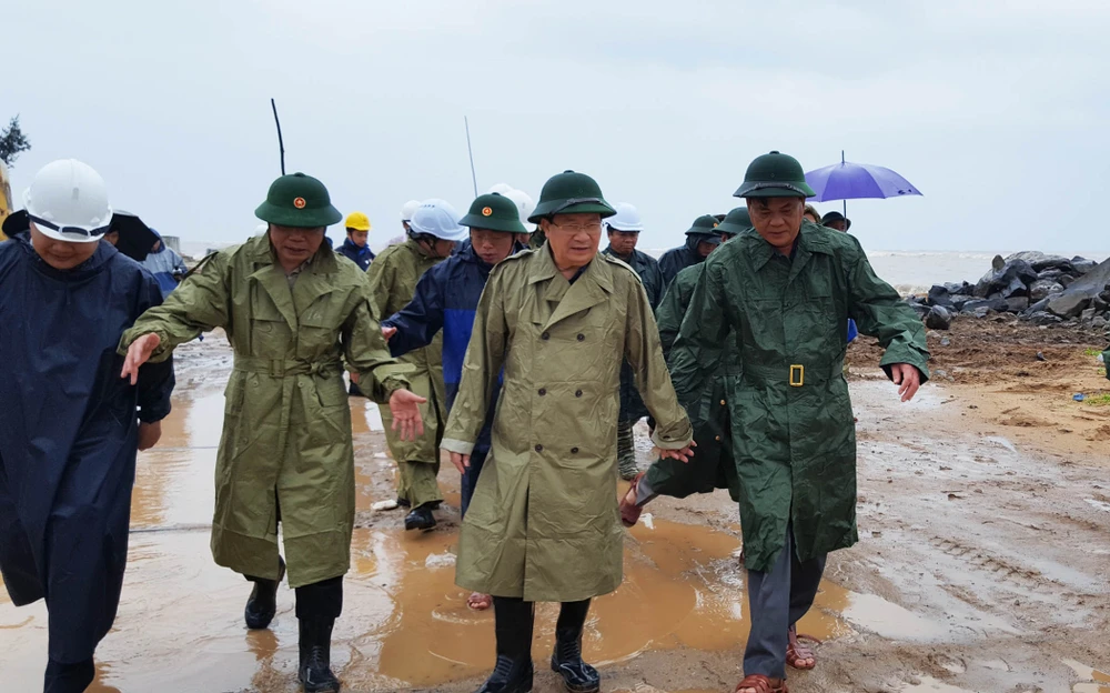 Phó Thủ tướng Trịnh Đình Dũng (thứ hai từ phải qua) thị sát, kiểm tra tình hình ứng phó bão số 12 tại Phú Yên. Ảnh: TẤN LỘC