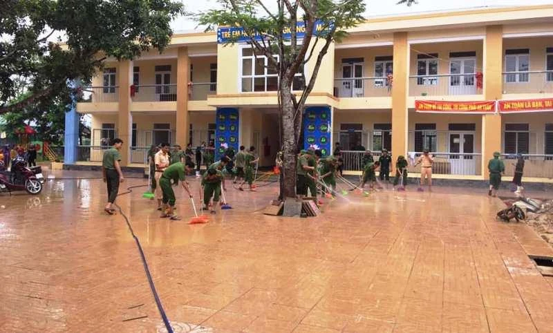 Công an, bộ đội đang giúp trường học dọn dẹp, rửa bùn sau khi nước lũ rút.
