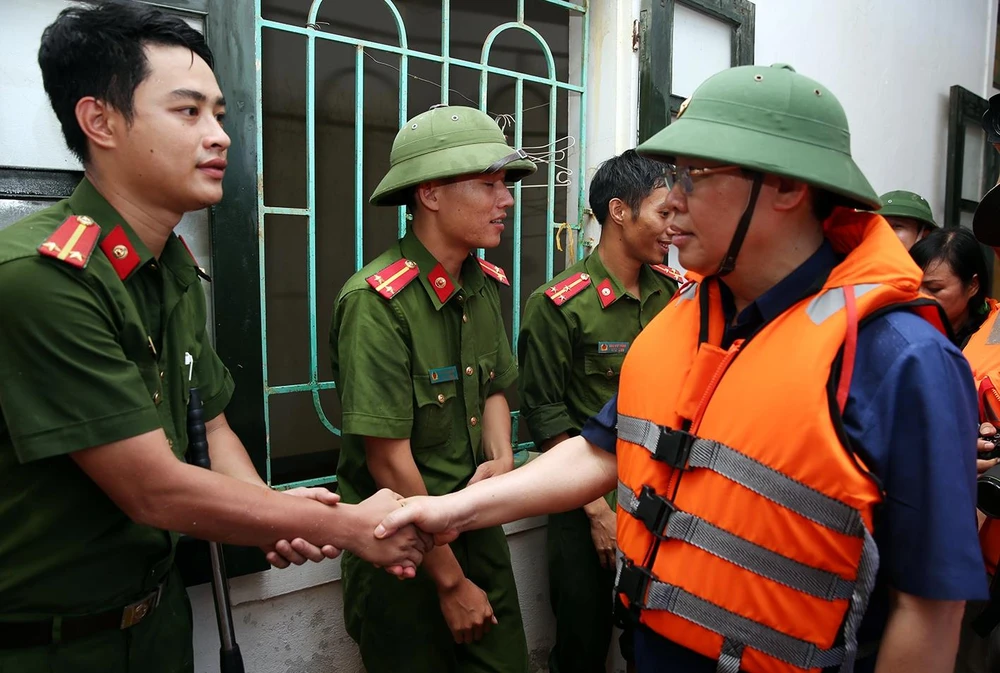 Phó Thủ tướng Vương Đình Huệ bắt tay động viên, trao quà cho lực lượng vũ trang tích cực giúp đỡ nhân dân trước, trong và sau mưa lũ.