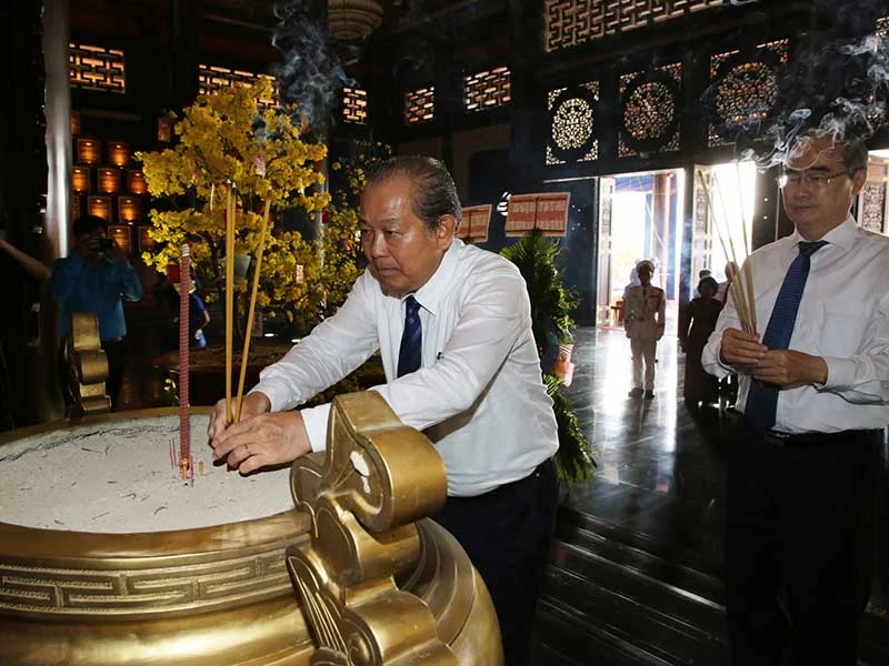 Phó Thủ tướng thường trực Trương Hòa Bình, Bí thư Thành ủy TP.HCM Nguyễn Thiện Nhân dâng hương tưởng niệm các anh hùng liệt sĩ và những người đã hy sinh vì đất nước tại đền Gia Định. Ảnh: VGP