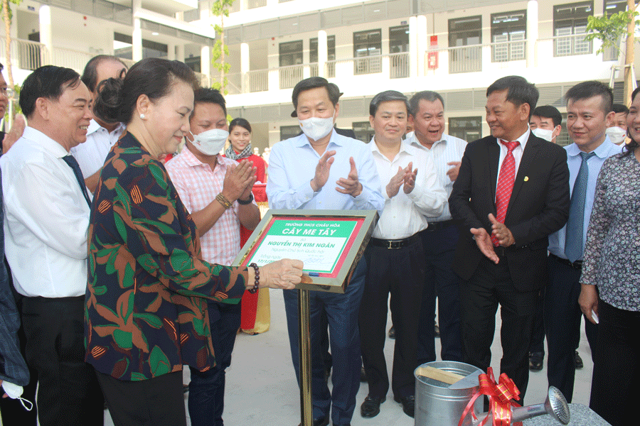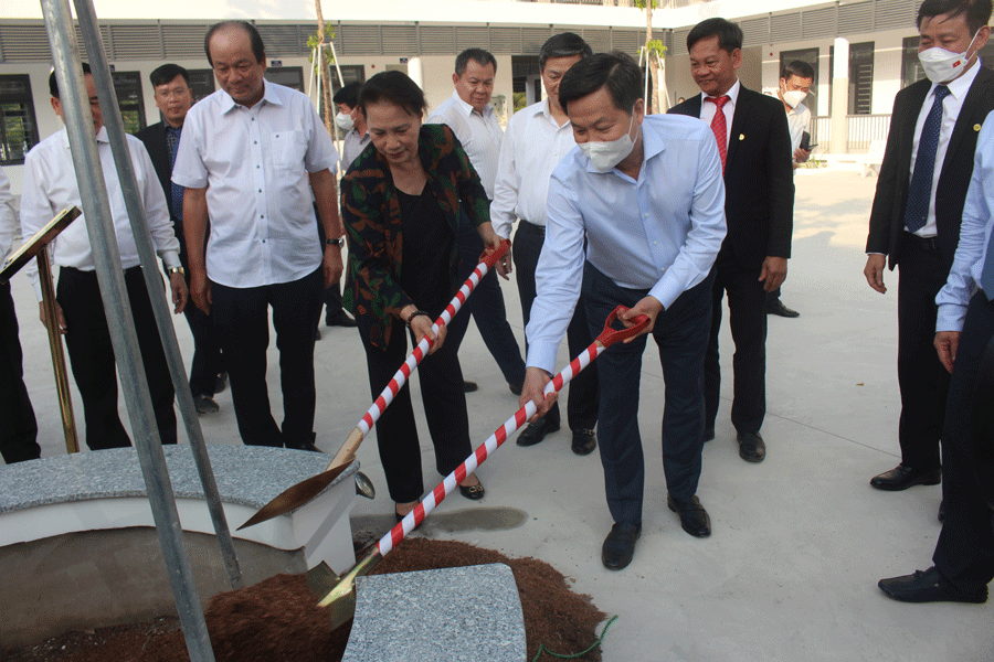 Phó Thủ tướng Lê Minh Khái, nguyên Chủ tịch Quốc hội Nguyễn Thị Kim Ngân cùng lãnh đạo tỉnh Bến Tre đã trồng cây lưu niệm trong khuôn viên trường.