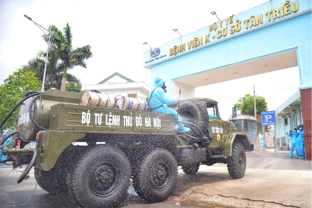 Phun khử khuẩn tại BV K Cơ sở Tân Triều, Hà Nội. Ảnh: HP