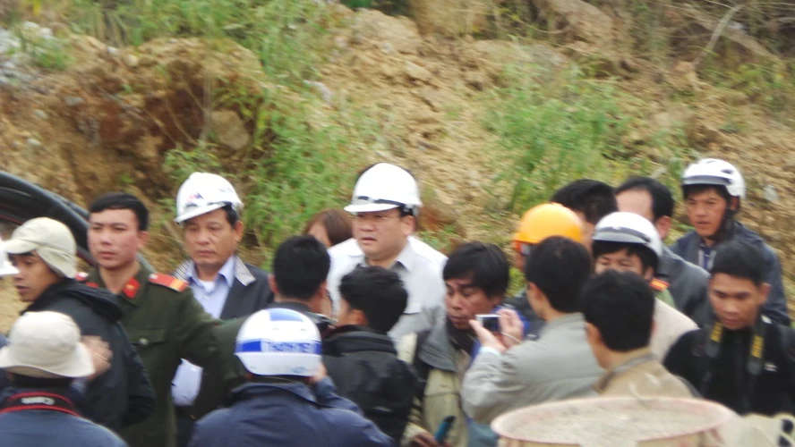 Phó thủ tướng Hoàng Trung Hải (áo ghi nhạt) có mặt ở hiện trường hầm thủy điện bị sập