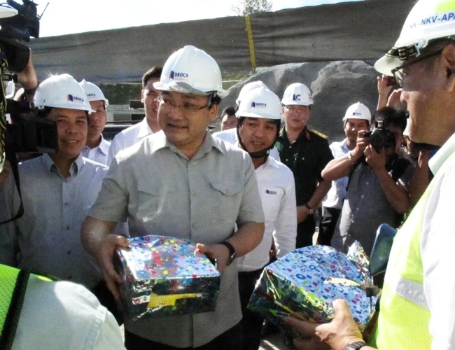 Phó Thủ tướng Hoàng Trung Hải tặng quà, động viên các đơn vị thi công, giám sát. Ảnh: TẤN LỘC