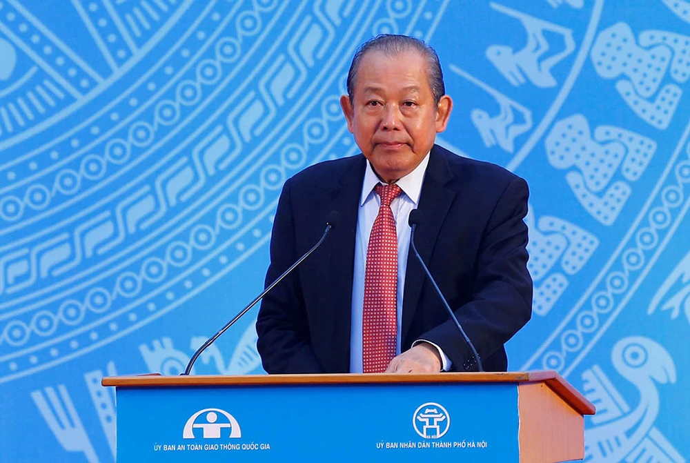 Phó Thủ tướng Thường trực Chính phủ Trương Hòa Bình, Chủ tịch Uỷ ban An toàn giao thông quốc gia phát biểu tại Lễ ra quân. Ảnh: VGP