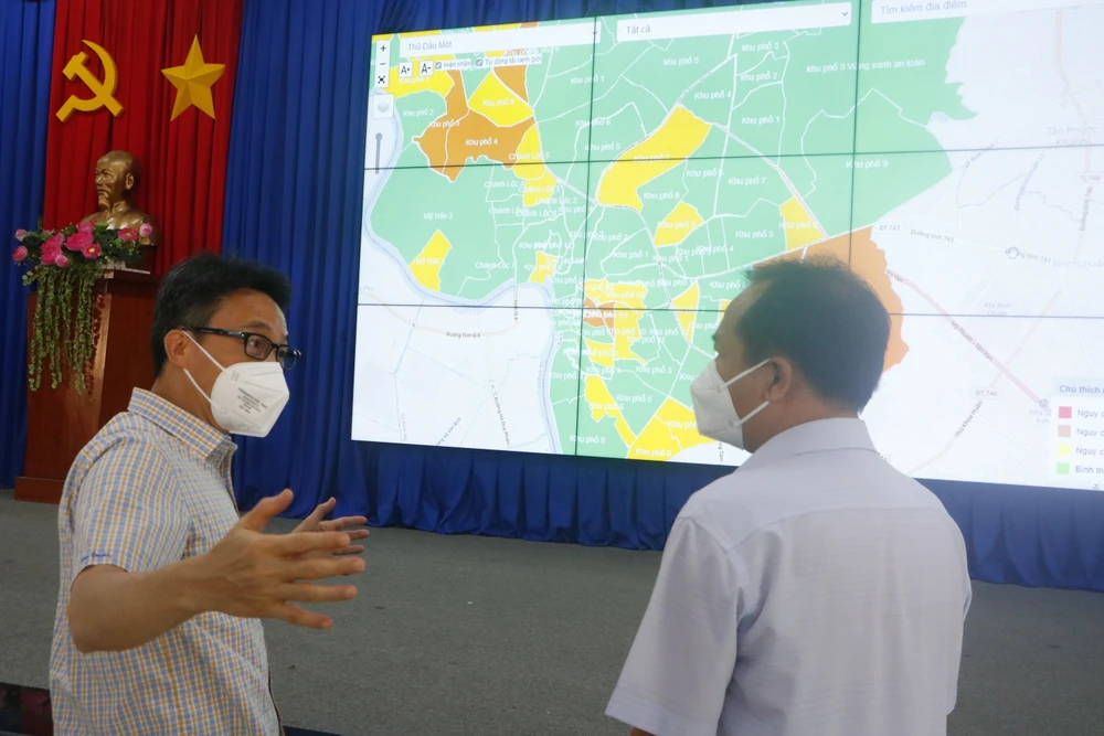 Phó Thủ tướng trao đổi với ông Nguyễn Văn Đông-Bí thư TP Thủ Dầu Một về công tác chống dịch. Ảnh: LÊ ÁNH