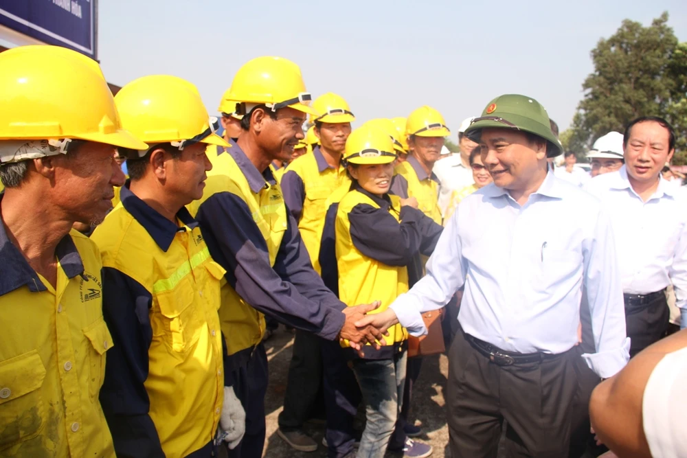 Phó Thủ tướng Nguyễn Xuân Phúc thăm hỏi lực lượng thi công khắc phục sự cố cầu Ghềnh. Ảnh: TIẾN DŨNG