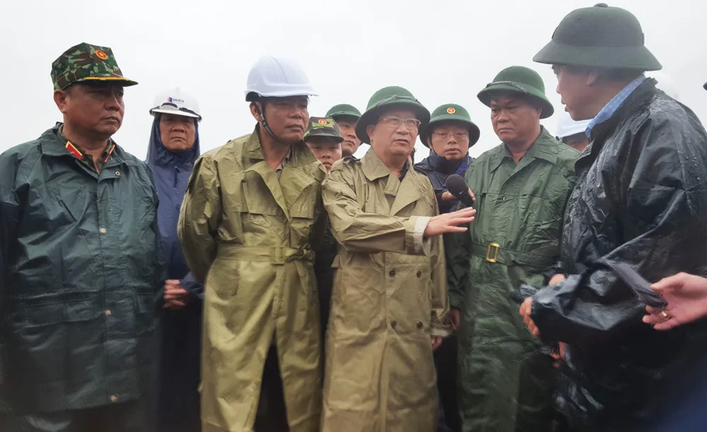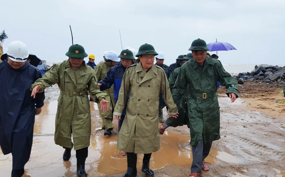 Phó Thủ tướng Trịnh Đình Dũng (thứ hai từ phải sang) thị sát, kiểm tra việc ứng phó bão số 12 tại bờ biển Phú Yên. Ảnh: TẤN LỘC