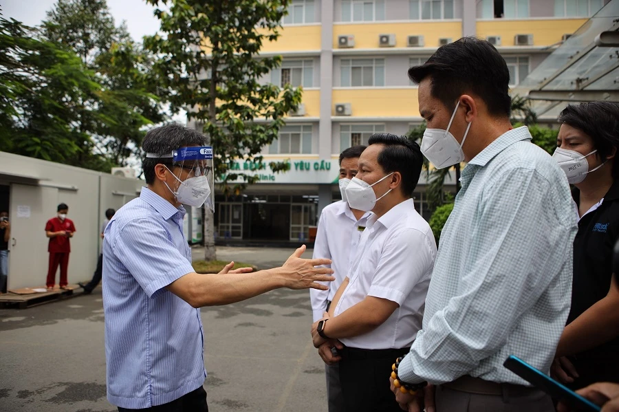 Phó Thủ tướng Vũ Đức Đam trao đổi với lãnh đạo TP Thủ Đức và lãnh đạo Bệnh viện Lê Văn Thịnh. Ảnh: NGUYỆT NHI