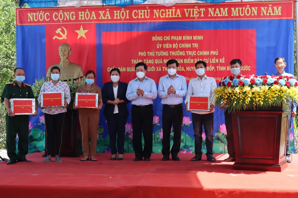 Ngày 6-4, Phó Thủ tướng Thường trực Chính phủ Phạm Bình Minh dẫn đầu đoàn công tác Trung ương đã đến thăm và tặng quà nhân dân tại điểm dân cư liền kề chốt dân quân biên giới thuộc xã Thanh Hòa, huyện Bù Đốp, Bình Phước.