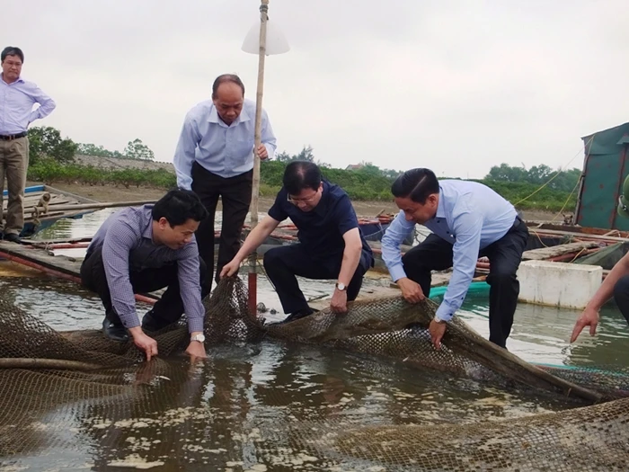 Phó Thủ tướng Chính Phủ Trịnh Đình Dũng cùng lãnh đạo tỉnh Hà Tĩnh trực tiếp kiểm tra nuôi cá lồng nước mặt, thăm hỏi, động viên bà con nhân dân ở thị xã Kỳ Anh (Hà Tĩnh) vào ngày 24-4.