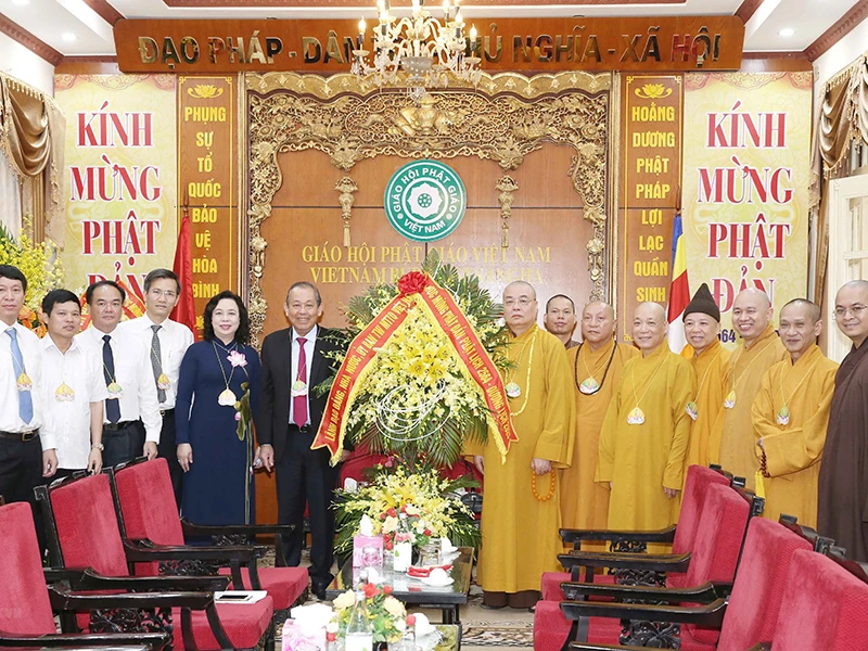 Phó Thủ tướng thường trực Trương Hòa Bình tặng hoa chúc mừng Trung ương Giáo hội Phật giáo Việt Nam nhân đại lễ Phật đản 2020 - Phật lịch 2564. Ảnh: TTXVN