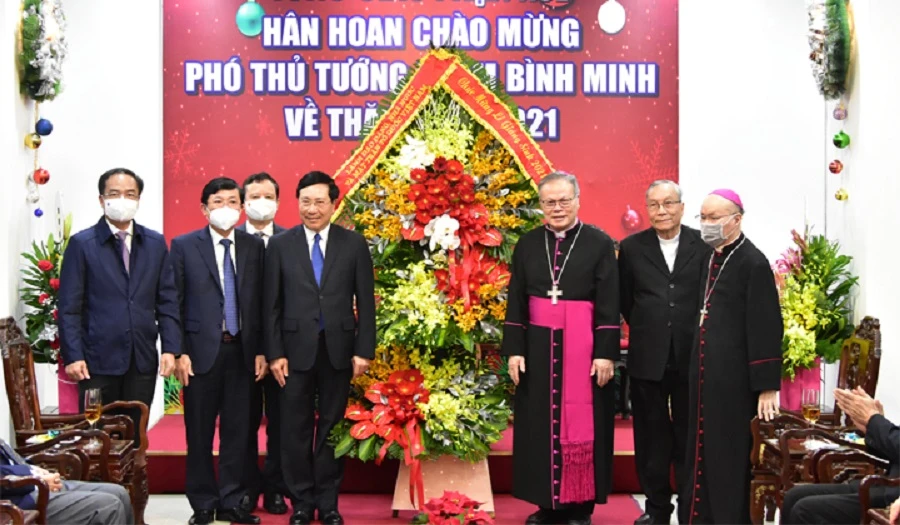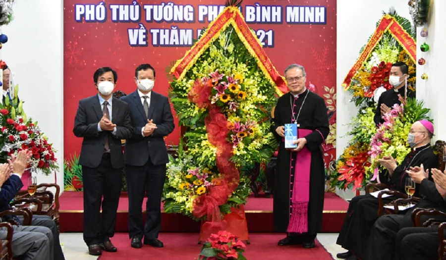 Thay mặt lãnh đạo Đảng, Nhà nước, Phó Thủ tướng Thường trực Chính phủ Phạm Bình Minh gửi lời chào trân trọng, lời thăm hỏi ân cần và lời chúc mừng tốt đẹp nhất nhân dịp Giáng sinh và năm mới 2022 tới Tổng Giám mục Nguyễn Chí Linh, linh mục, tu sĩ và đồng bào Công giáo.