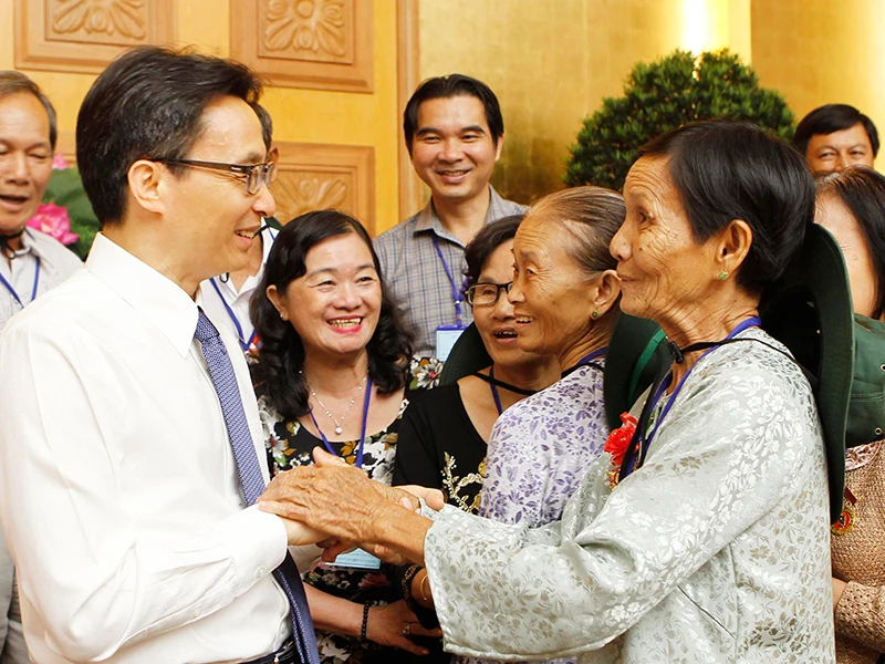 Phó Thủ tướng Vũ Đức Đam trao đổi với các đại biểu người có công tỉnh Tiền Giang. Ảnh: TTXVN