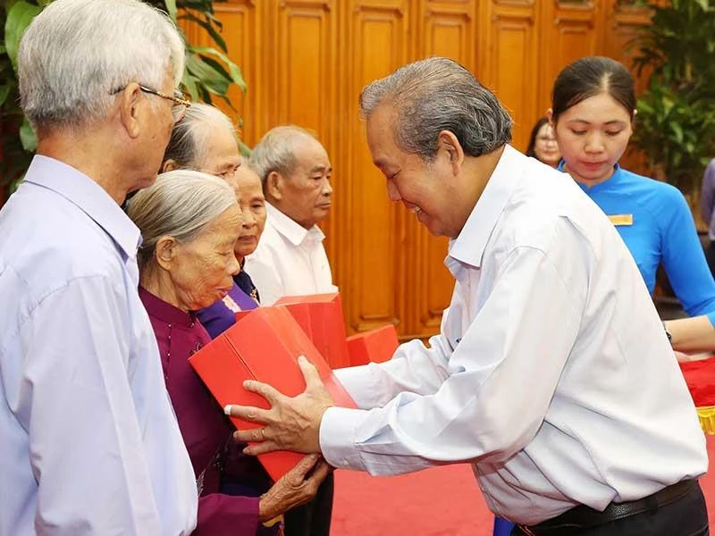 Phó Thủ tướng Thường trực Trương Hòa Bình trao quà cho đoàn người có công tỉnh Thừa Thiên-Huế. Ảnh: TTXVN