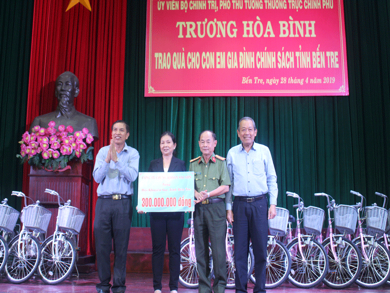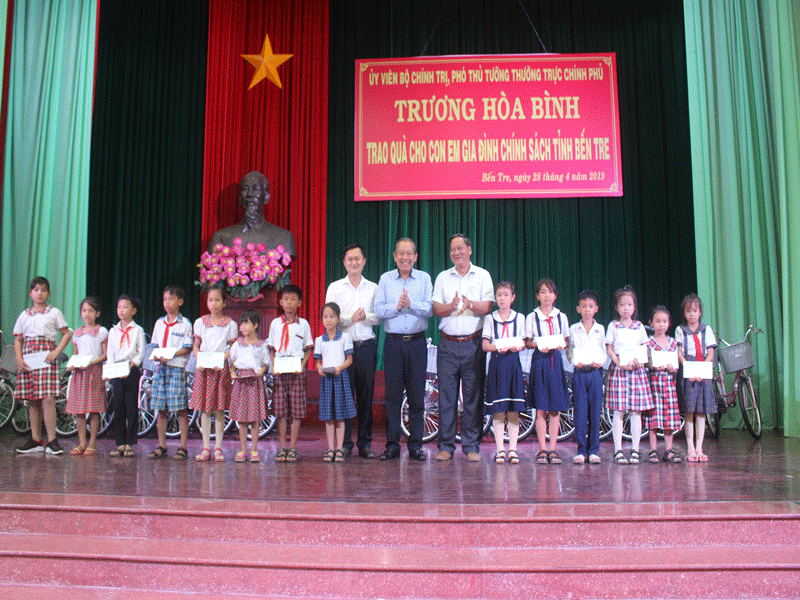 Nhân đây, Phó Thủ tướng Trương Hòa Bình mong muốn và đề nghị lãnh đạo Tỉnh ủy, UBND tỉnh Bến Tre tiếp tục quan tâm hơn nữa, chỉ đạo các đơn vị giáo dục, các trường học nhất là các trường ở vùng sâu, vùng xa của tỉnh triển khai nhiều biện pháp, có nhiều chính sách cho các cháu học sinh nghèo hiếu học, vươn lên vượt khó, có điều kiện đến trường học tập.