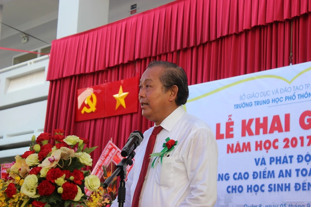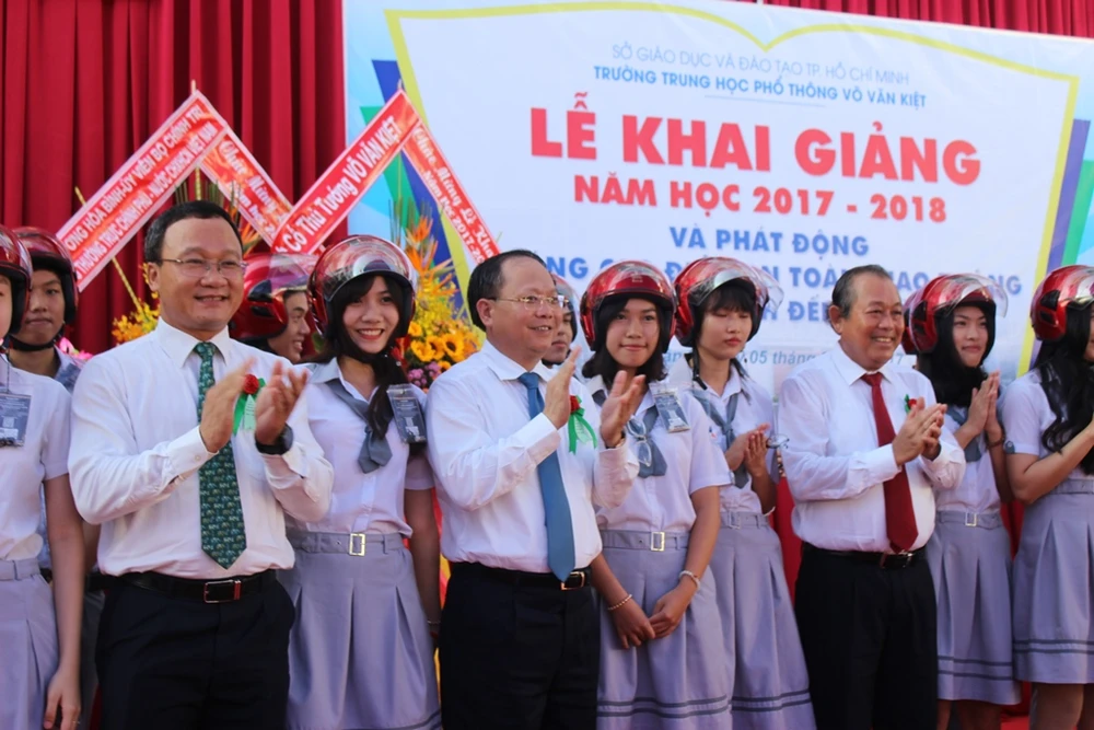 Sáng 5-9, Phó Thủ tướng Thường trực Trương Hòa Bình, Phó Chủ tịch chuyên trách Ủy ban An toàn giao thông quốc gia Khuất Việt Hùng đã đến dự lễ khai giảng tại trường THPT Võ Văn Kiệt (quận 8).