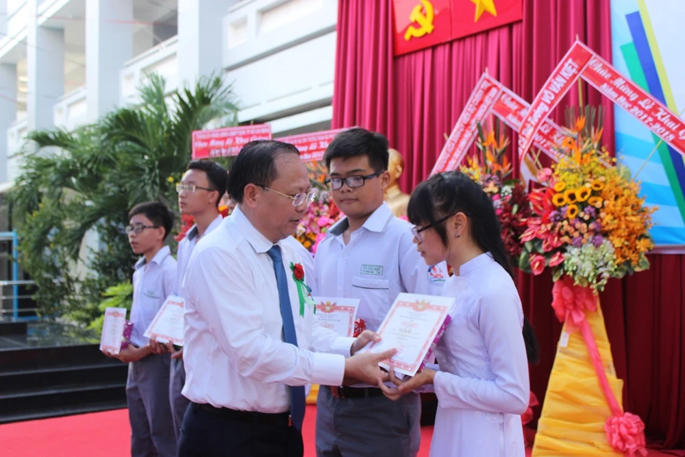 Phó Bí thư Thành ủy TP.HCM Tất Thành Cang trao tặng giấy khen và phần thưởng cho năm học sinh xuất sắc toàn trường
