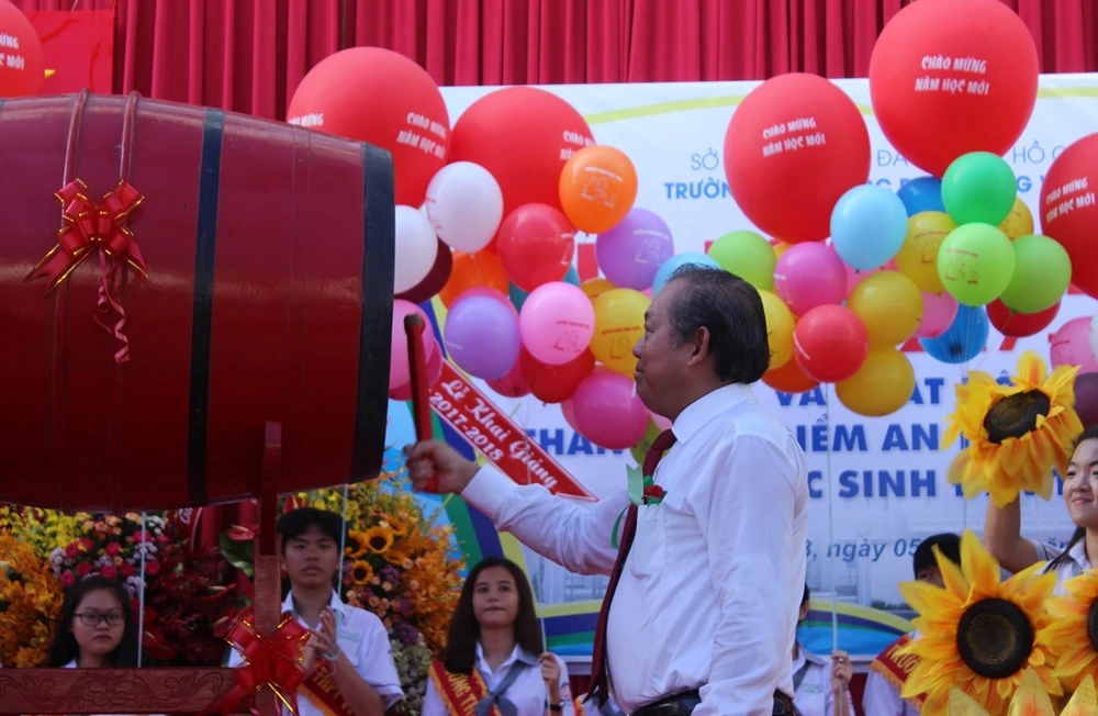 Phó Thủ tướng Thường trực Trương Hòa Bình đánh trống khai giảng năm học mới tại trường