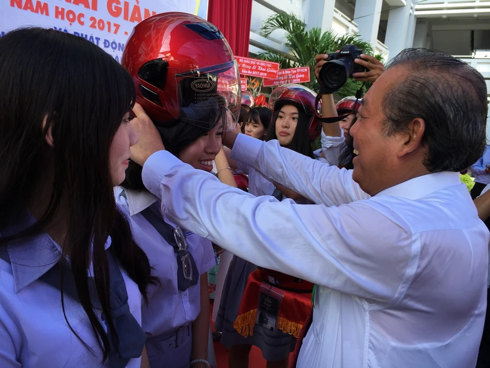 Phó Thủ tướng Trương Hòa Bình đội nón bảo hiểm cho các em học sinh