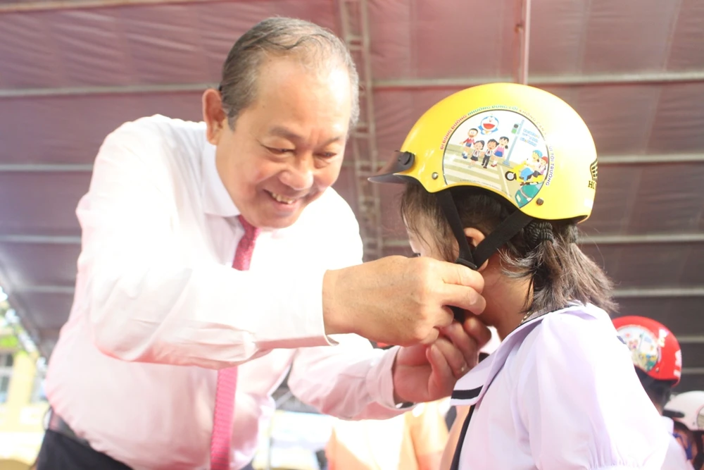 Phó Thủ tướng trao tặng mũ bảo hiểm cho học sinh.