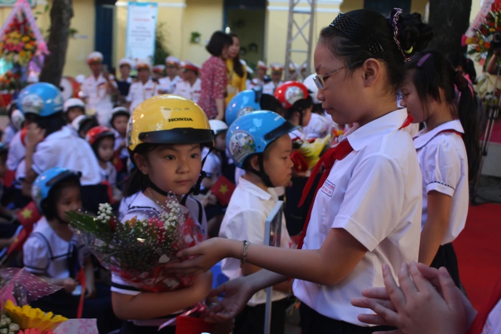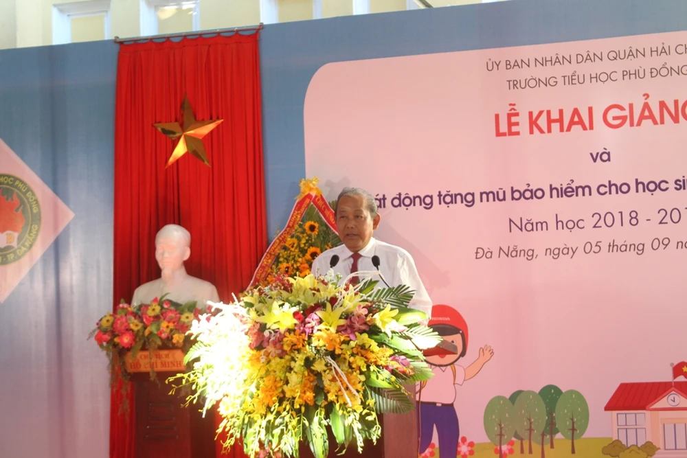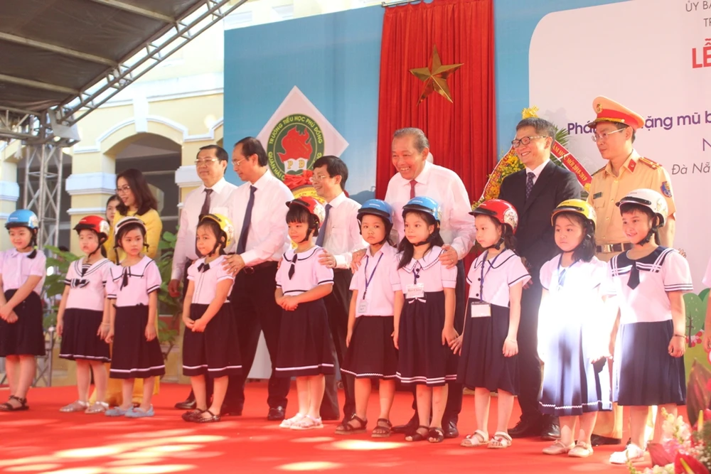 Cũng trong dịp này, Phó Thủ tướng đã chính thức phát động “Tháng cao điểm ATGT cho học sinh đến trường”. Sau khi đánh trống khai giảng năm học mới, ông đã tận tay trao từng chiếc mũ bảo hiểm cho các học sinh lớp 1.